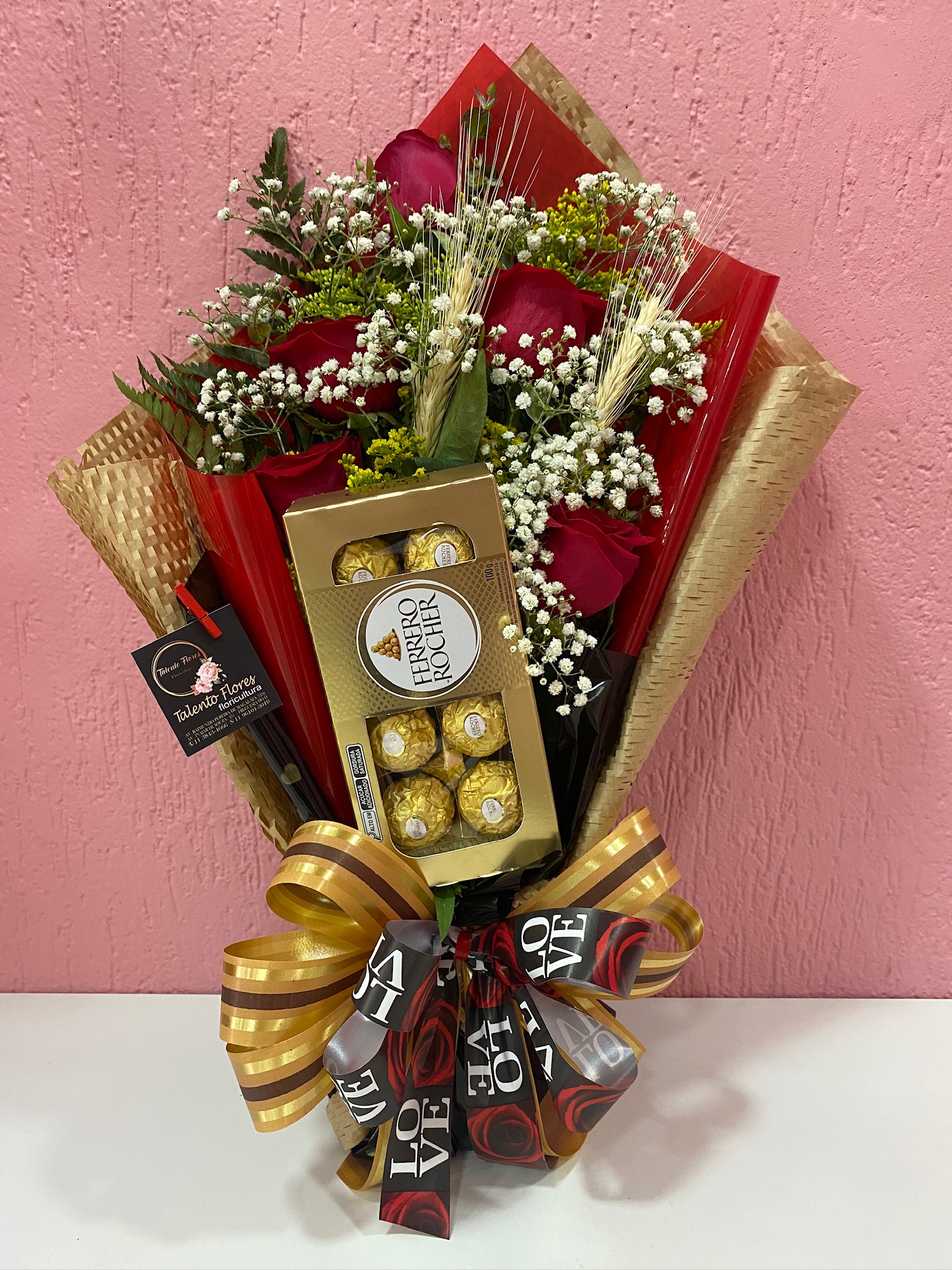 Elegância e sofisticação em um só presente! O Ramalhete com 5 Rosas, Trigos e Ferrero Rocher é a combinação perfeita de flores delicadas e o sabor irresistível de chocolates premium. Ideal para demonstrar carinho e afeto em qualquer ocasião, este ramalhete transmite uma mensagem de beleza e bom gosto, acompanhado de um toque doce e especial.